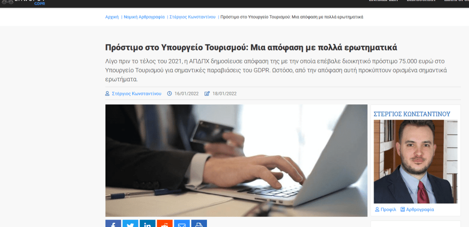 Με την υπ’ αρ. 55/2021, η Αρχή Προστασίας Δεδομένων Προσωπικού Χαρακτήρα επέβαλε ένα από τα πιο υψηλά πρόστιμα στην ιστορία της. Η απόφασή της αυτή στηρίχθηκε στο γεγονός ότι το Υπουργείο Τουρισμού: