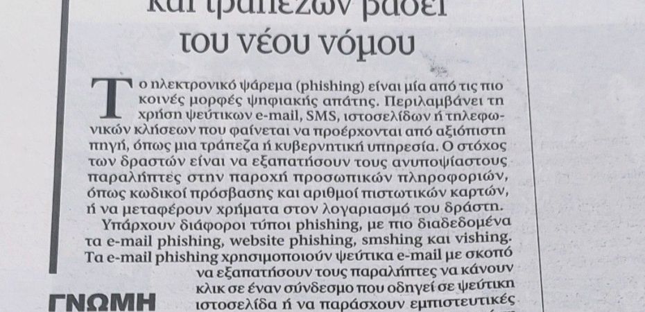 Το ηλεκτρονικό ψάρεμα (phishing) είναι μια από τις πιο κοινές μορφές ψηφιακής απάτης. Περιλαμβάνει τη χρήση ψεύτικων emails, SMS, ιστοσελίδων ή τηλεφωνικών κλήσεων που φαίνεται να προέρχονται από αξιόπιστη πηγή, όπως μια τράπεζα ή κυβερνητική υπηρεσία. Ο στόχος των δραστών είναι να εξαπατήσουν τους ανυποψίαστους παραλήπτες στην παροχή προσωπικών πληροφοριών, όπως κωδικούς πρόσβασης και αριθμούς πιστωτικών καρτών, ή να μεταφέρουν χρήματα στον λογαριασμό του δράστη.